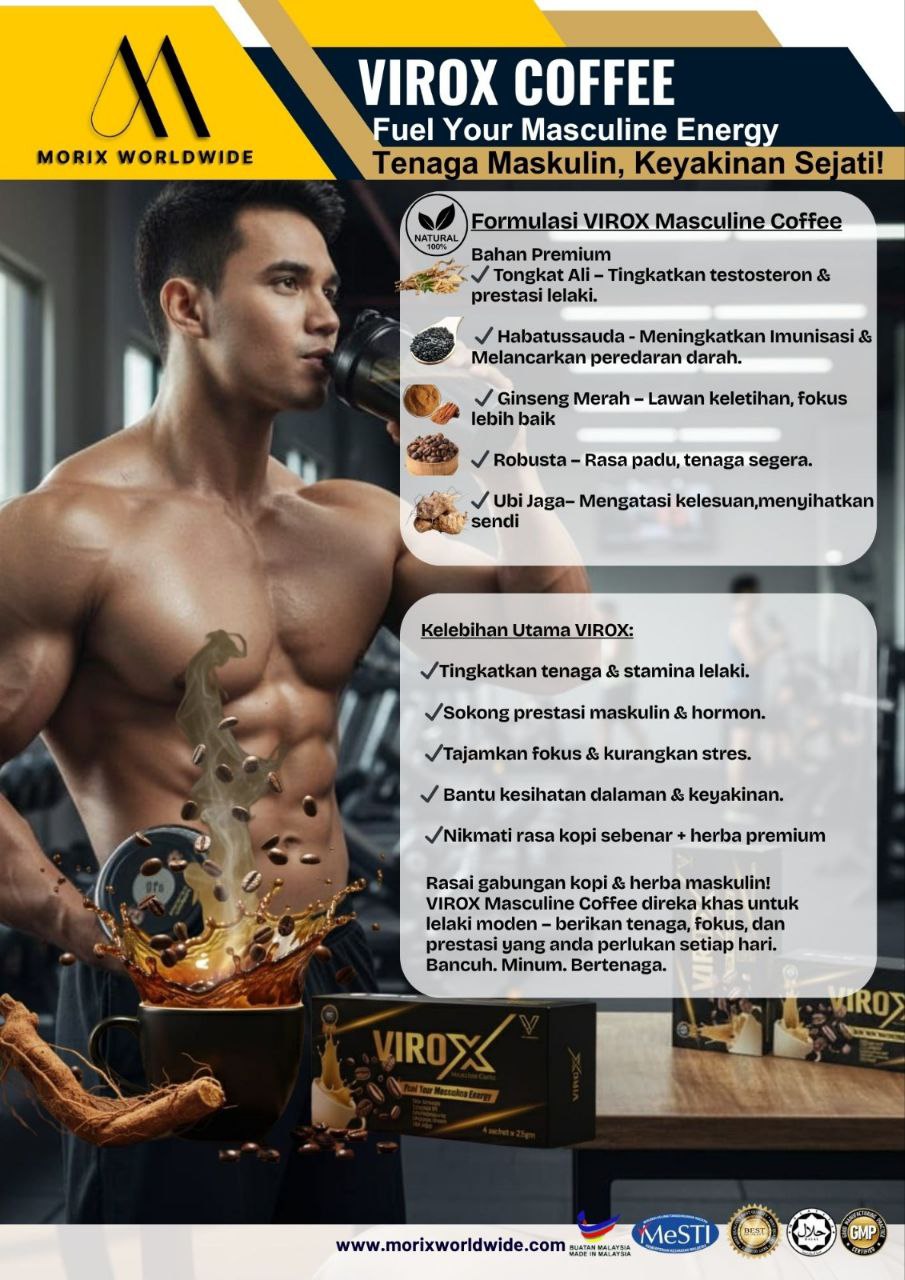 Lelaki sejati perlukan tenaga, prestasi, dan fokus tanpa kompromi. VIROX Masculine Coffee dicipta khas dengan formulasi premium Tongkat Ali, Habbatussauda, Ginseng Merah, Robusta, dan Ubi Jaga – gabungan mantap kopi sebenar & herba eksklusif untuk lelaki moden yang mahukan lebih daripada sekadar secawan kopi. Kuasa & Kelebihan VIROX Tingkatkan tenaga & stamina lelaki. Sokong prestasi maskulin & hormon. Tajamkan fokus & kurangkan stres. Bantu kesihatan dalaman & keyakinan. Nikmati rasa kopi premium + herba unggul. Bayangkan anda lebih bertenaga, lebih fokus, dan lebih yakin setiap hari. VIROX bukan sekadar kopi – ia adalah senjata lelaki moden untuk terus melangkah jauh, beraksi cemerlang, dan mencapai puncak prestasi. Bancuh. Minum. Bertenaga. VIROX COFFEE – Fuel Your Masculine Energy!