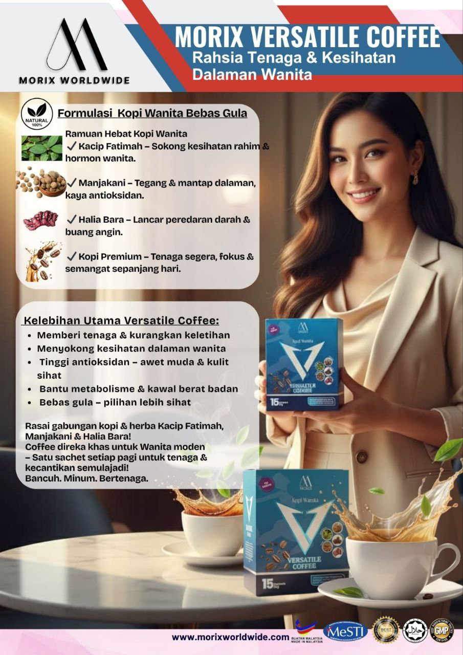 Adakah anda sering letih, kurang fokus, atau kurang bertenaga? Kini hadir MORIX VERSATILE COFFEE – kopi istimewa tanpa gula yang diformulasi khas untuk wanita moden. Dengan gabungan Kacip Fatimah, Manjakani, Halia Bara & Kopi Premium, setiap sachet bukan sekadar minuman, tetapi rahsia kecantikan & tenaga dalaman anda! Sokong kesihatan rahim & hormon wanita Awet muda, kulit sihat & berseri Bantu kawal berat badan & tingkatkan metabolisme Tingkatkan tenaga, fokus & semangat sepanjang hari Bebas gula – lebih sihat & selamat Rasai sendiri kelainan kopi wanita premium ini – bukan sekadar kopi, tetapi penjagaan dalaman & kecantikan semulajadi. Setiap pagi, hanya 1 sachet bancuhan ringkas mampu memberi tenaga, keyakinan & aura menawan yang berkekalan! MORIX VERSATILE COFFEE Rahsia Dalaman Sihat, Luaran Berseri! Bancuh. Minum. Bertenaga.