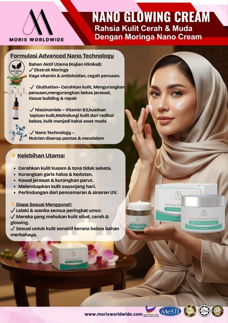 “Nak kulit cerah, putih & awet muda?” Moringa Nano Cream – gabungan Ekstrak Moringa, Glutathione & Niacinamide! Cerahkan kulit kusam, hilangkan parut & kurangkan kedutan! Rasa lembap, halus & glowing setiap hari! Moringa Nano Cream – Rahsia Kulit Muda & Bersinar!
