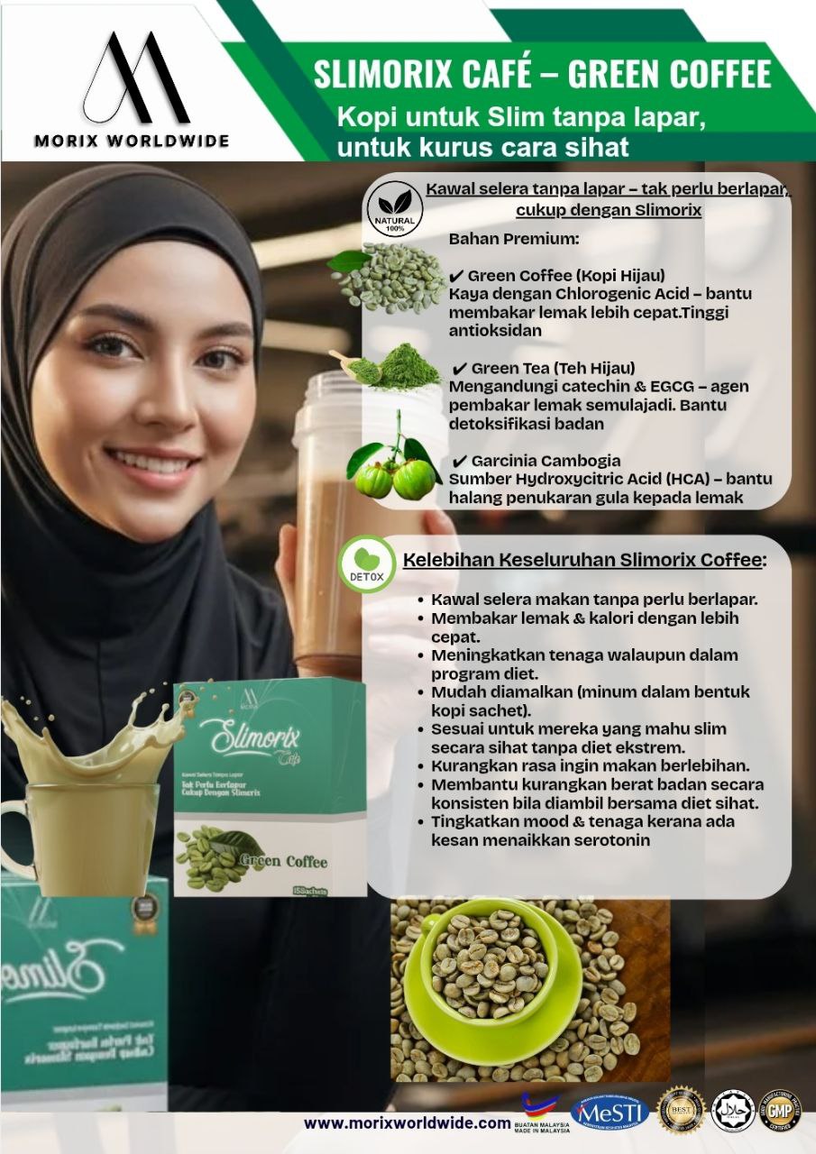 SLIMORIX CAFÉ – GREEN COFFEE Kopi Slim Tanpa Lapar, Untuk Kurus Secara Sihat! Kawal Selera Tanpa Lapar – tak perlu berlapar, cukup dengan Slimorix. Bakar Lemak Lebih Cepat – rahsia Chlorogenic Acid, Catechin & HCA. Detox & Segar – buang toksin, segarkan badan dari dalam. Slim Secara Sihat – bukan sekadar kurus, tapi penuh tenaga! Bahan Premium Slimorix Green Coffee (Kopi Hijau) – kaya Chlorogenic Acid, bantu pecahkan lemak & tinggi antioksidan. Green Tea (Teh Hijau) – mengandungi Catechin & EGCG, bakar lemak semulajadi & bantu detox. Garcinia Cambogia – sumber HCA, halang penukaran gula kepada lemak. Kelebihan Slimorix Café Kawal selera makan tanpa rasa lapar. Membakar kalori dengan lebih pantas. Kekal bertenaga walaupun dalam diet. Mudah diamalkan – hanya bancuh & minum. Sesuai untuk lelaki & wanita yang nak slim secara sihat. Kurangkan craving & rasa ingin makan berlebihan. Konsisten bantu turunkan berat badan. Tingkatkan mood & tenaga dengan serotonin booster. SLIMORIX CAFÉ – Kopi Hijau Rahsia Slim Sihat Tanpa Derita! Minum. Slim. Bertenaga.